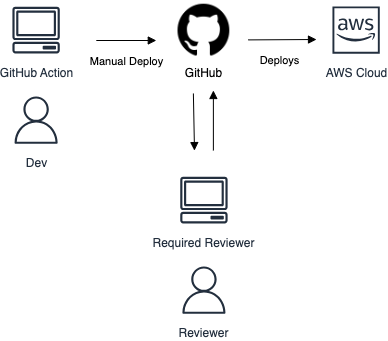 Your team decides to only allow manual deployments since infrastructure changes are highly disruptive. To deploy changes, your team defines a separate GitHub Action workflow that can only be manually triggered. Your team uses environments to define deployment targets. Environments allow configuration of secrets and protection rules. With rules, you can require reviewers for deployment jobs, adding another layer of security before changes are deployed to your infrastructure.